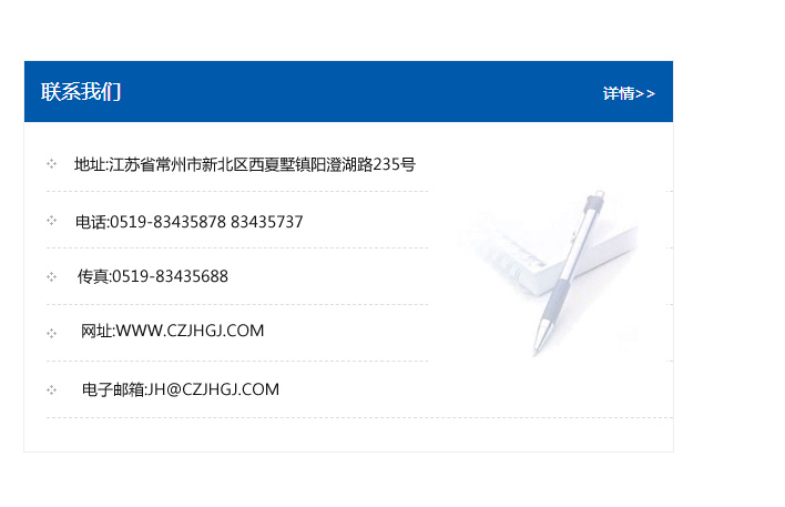 傳真:0519-83435688    郵編:213135    網址:WWW.czjhgj_com.hayuanyou.com    電子郵箱:JH@czjhgj_com.hayuanyou.com